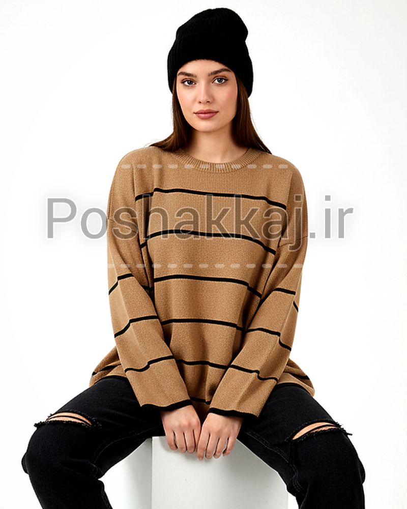بلوز بافت زنانه یقه دار یقه هفت باکسی آستین بلند طرح دو خط دوبل کد 1870