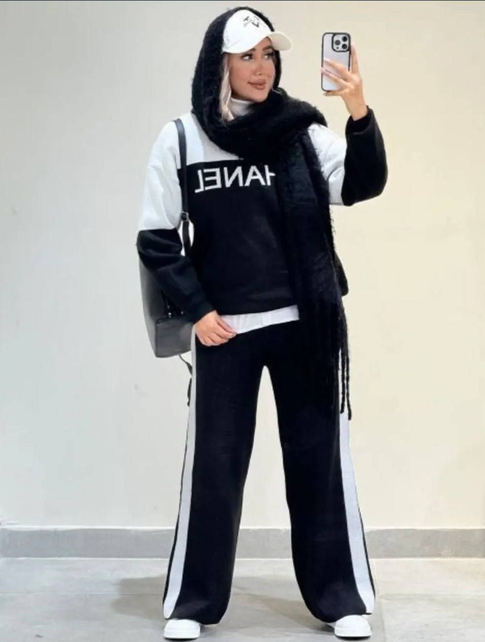 ست بافت زنانه بلوز شلوار دو رنگ طرح چنل chanel آستین بلند شلوار بغل خط کد 1933