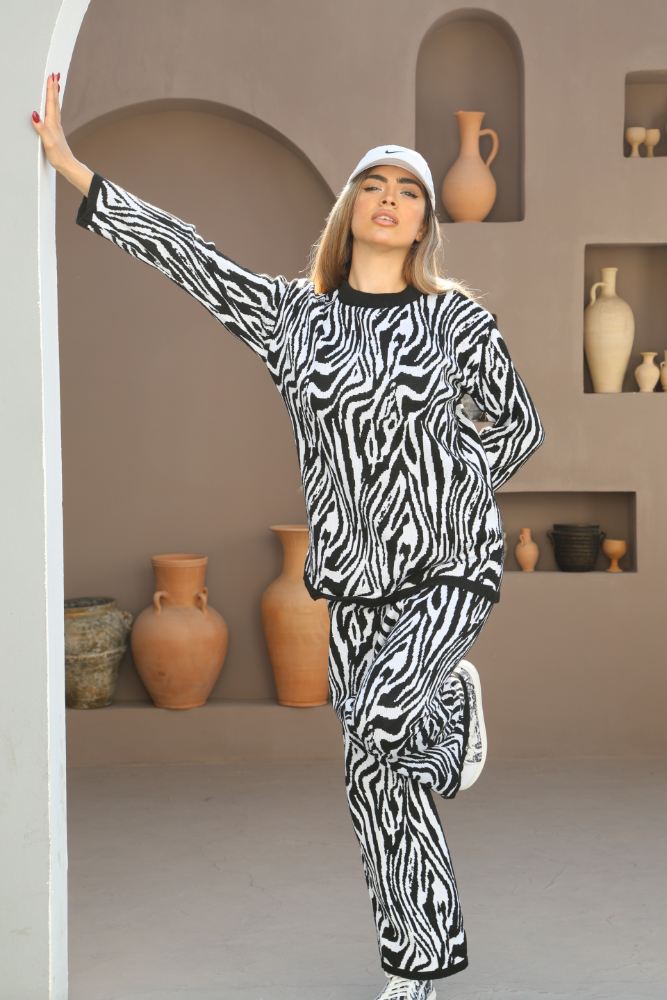ست بافت زنانه بلوز شلوار مدل زبرا یقه گرد آستین بلند کد 1878