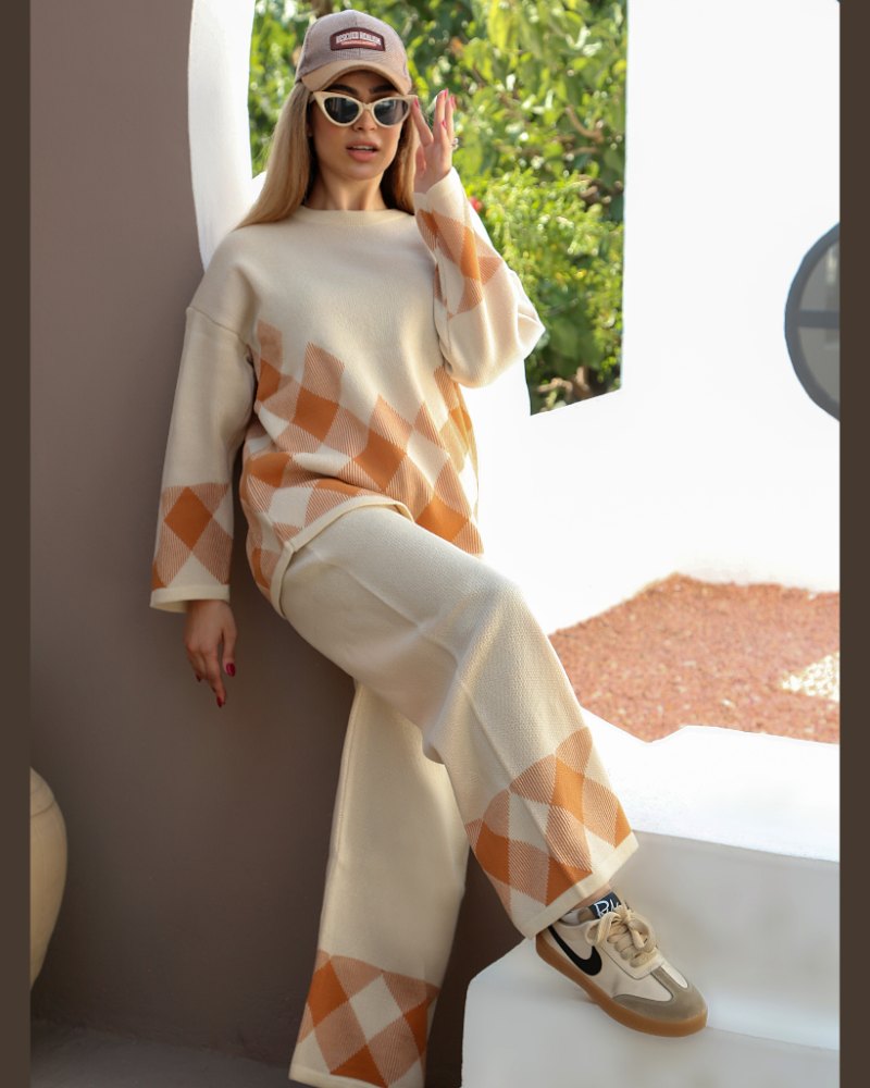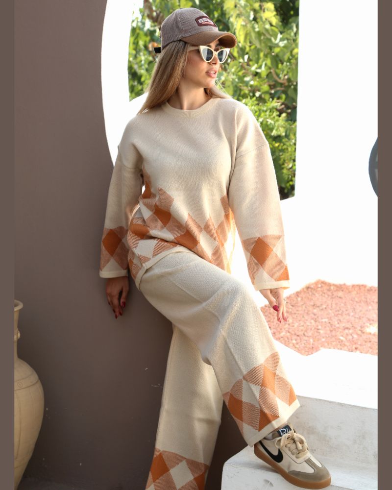 ست بافت زنانه دمپا طرح لوزی یقه گرد آستین بلند ریز بافت کد 1917