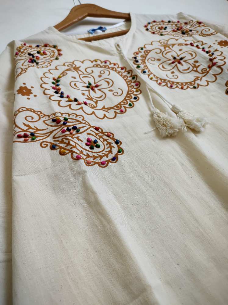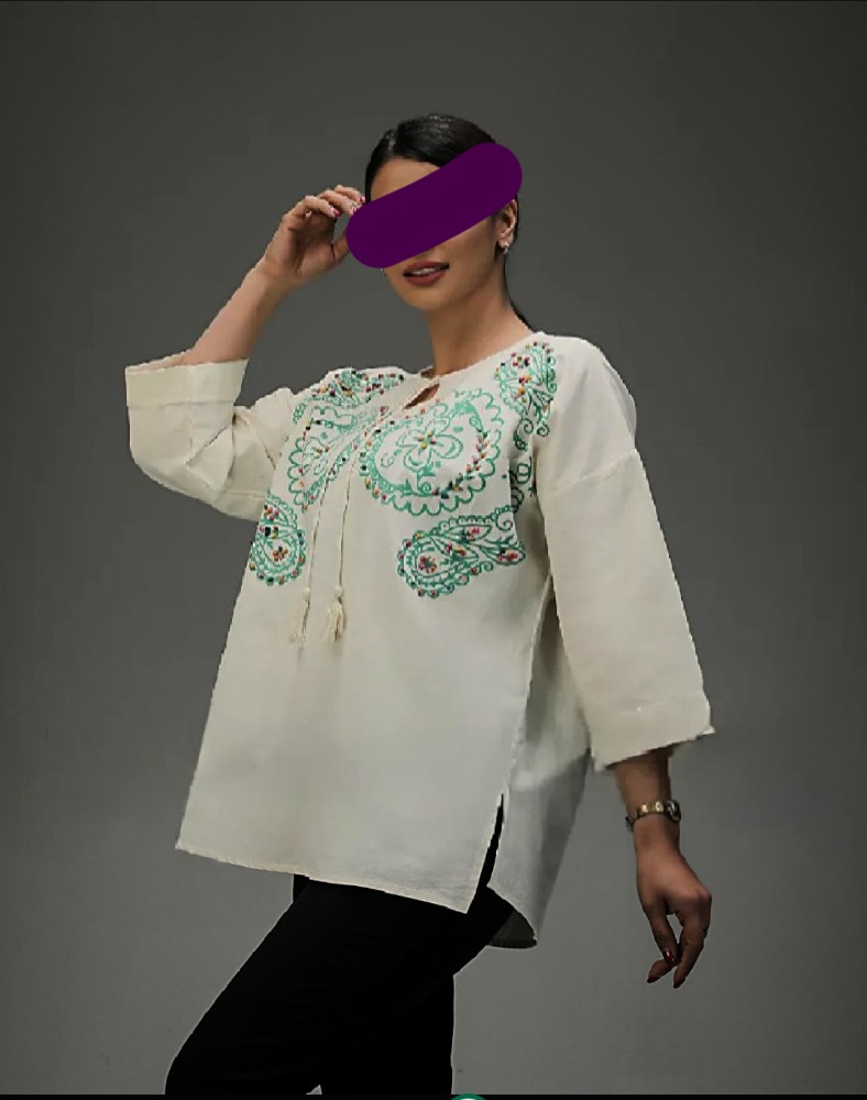 تونیک آستین سه ربع پاکتی طرح سنتی سنگ دوزی جلو بسته منگوله دار کد 1718